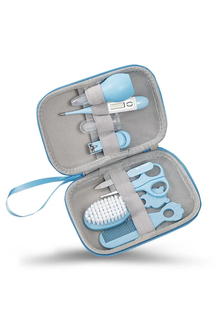 The kit includes a soft baby hairbrush, a gentle comb, a nail clipper with a rounded edge for safety, a pair of rounded-tip scissors, a nasal aspirator to help with stuffy noses, a digital thermometer for accurate temperature readings, a medicine dropper for easy dosage administration, and a fingertip toothbrush to promote oral hygiene right from the start.
