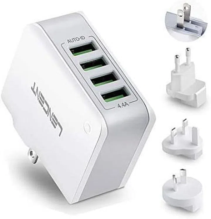 It features a compact and lightweight design, with a foldable plug and interchangeable plugs for use in different countries. It also has four USB ports, allowing you to charge multiple devices simultaneously.