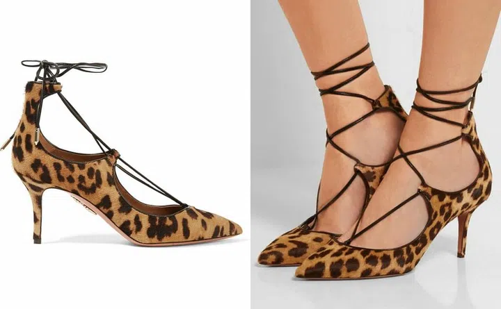 Aquazzura Christy Lace-Up Leopard-Print Calf Hair Pumps via net-a-porter.com, US$911 (approximately S$1239.64)