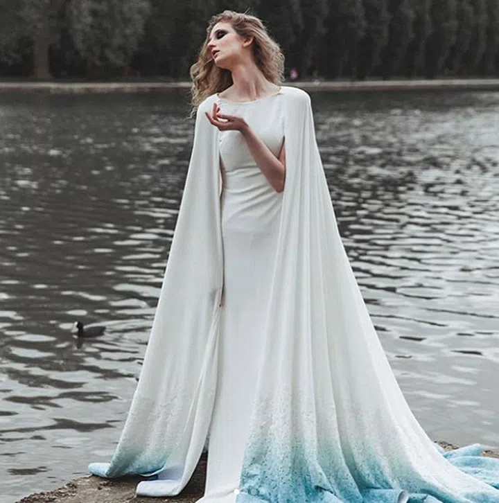 If you're going for a regal look, a bridal cape is always a good idea. Tony Ward gives this otherwise minimalist look an eye-catching twist with a gorgeous turquoise hue at the hem.