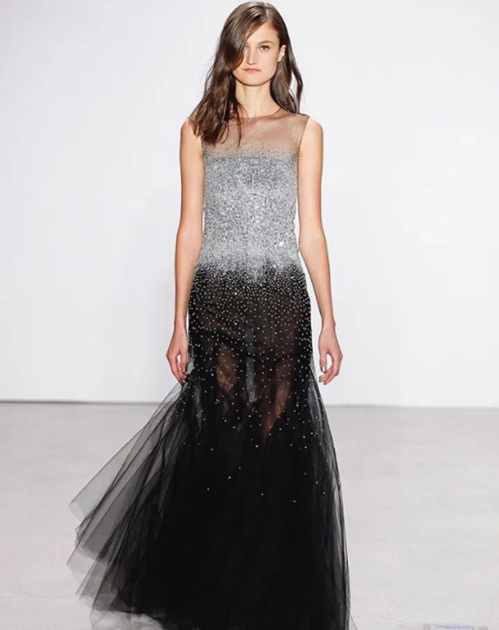Wearing black for your wedding might seem a safe choice, what with the plethora of bold jewel tones, and dreamy pastels available. But Oscar de la Renta's set on changing minds with this sytlish number paired with plenty of silvery shimmer and breezy tulle layers.