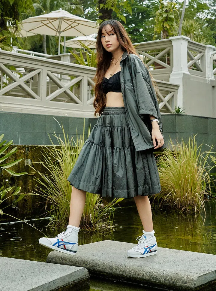 Fashion is currently obsessed with bare-midriff numbers but here, a bikini top is layered with an oversized shell top and nylon full skirt. Extra brownie points for wearing the MEXICO 66 SD M PF high-cut sneakers with ruffle socks.