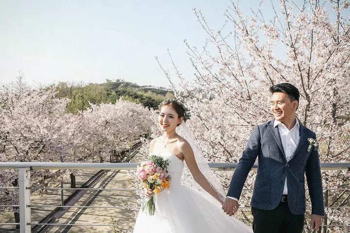 Corvina Chong and Aden Wong had dreamy, cherry blossom-filled shoot in Seoul with photographer Kim Beom Soo, whom they found through OneTwoThreeFour.