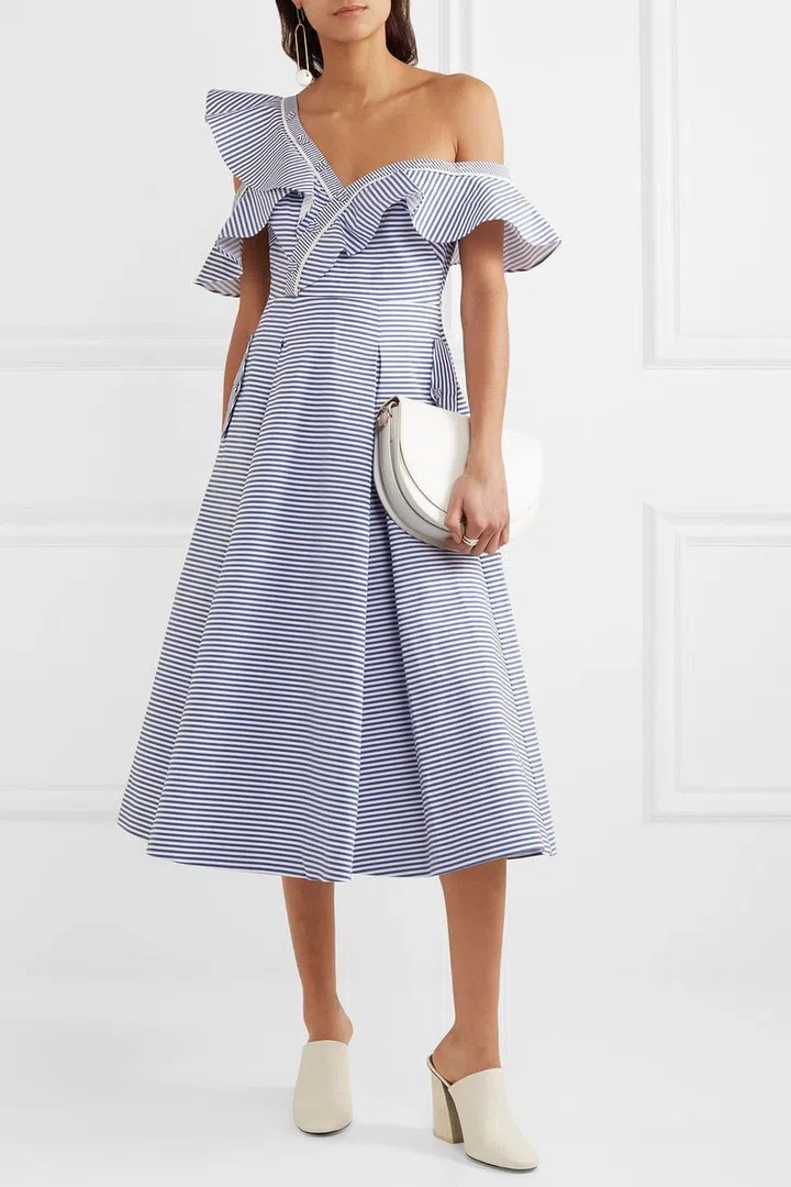 Self-portrait, off-the-shoulder striped cotton-poplin midi dress, $395 from Net-a-porter