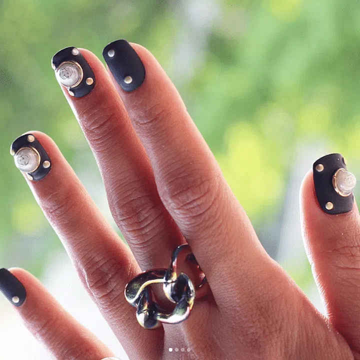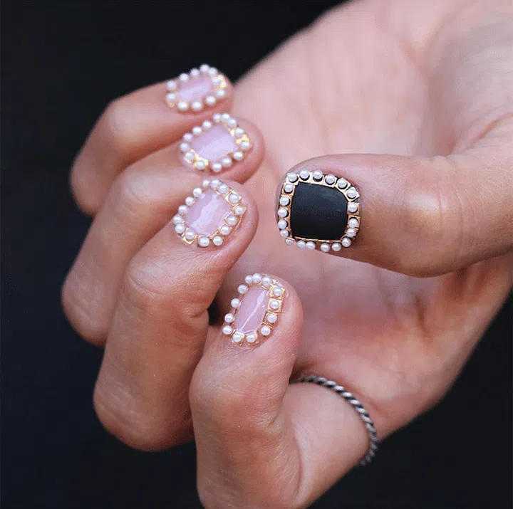 We love this: Outline your clear glossy manicure with gold and pearl, and if you want a little more, spice it up with a rebellious black base colour on a finger like this modern take!