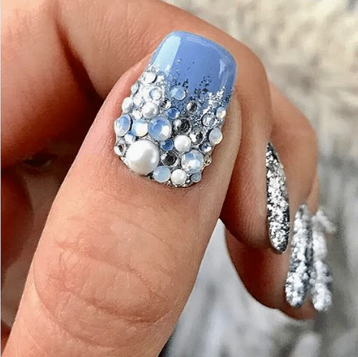 GIve your wedding ensemble something blue with a pretty blue manicure, then up the glamour with plenty of glitter and rhinestones!