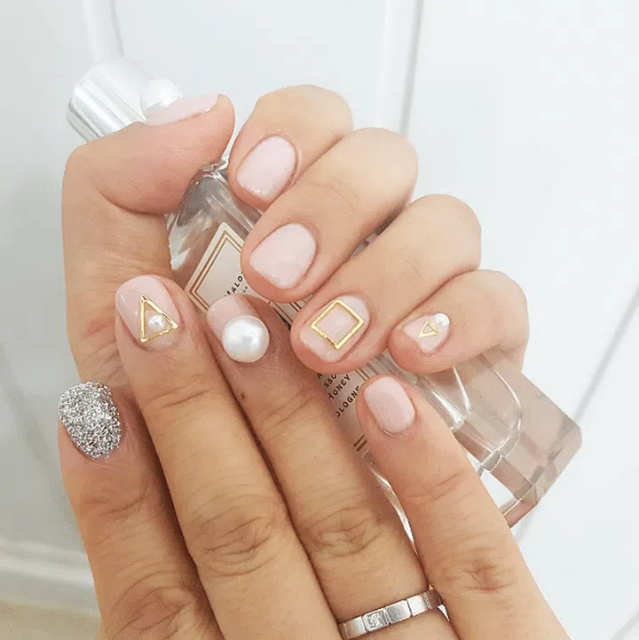 Enhance a pastel pink manicure with pearls, glitz and geometric gold details - it's fun, contemporary and totally aisle-worthy.