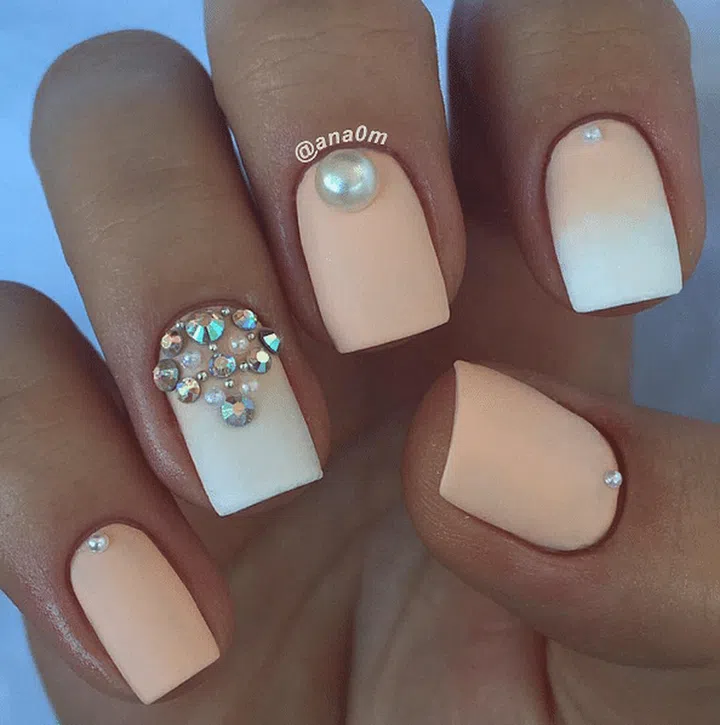 Can't decide between ombre nails, pearls or crystals? Have them all! The rhinestones on the ring finger will only add to the sparkle of your engagement ring.