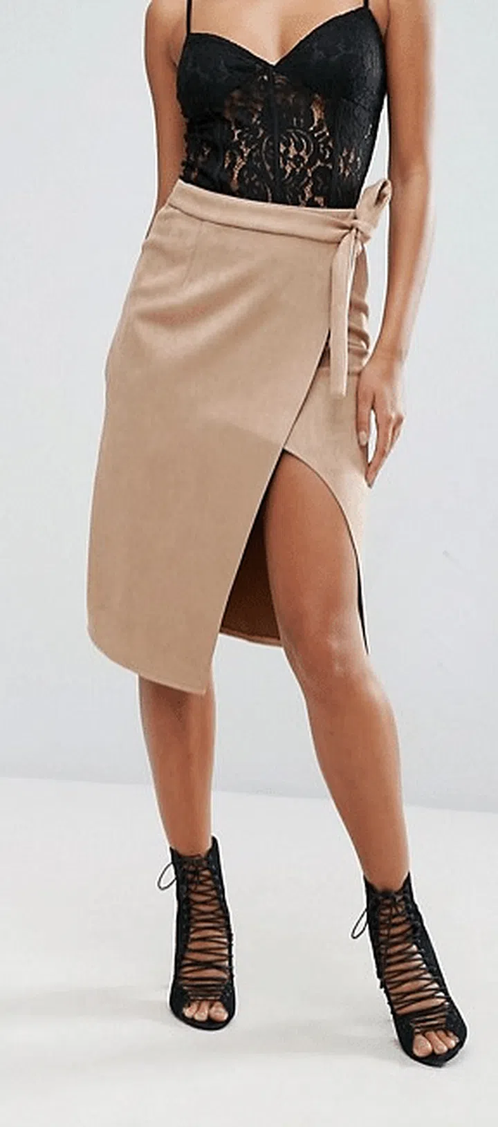 Made from a beige suedette, NaaNaa’s pencil skirt with tie detail will be your go-to skirt whenever you’re pressed for time...but be sure to pair it with a modest top as the high slit can be somewhat revealing for certain office environments.