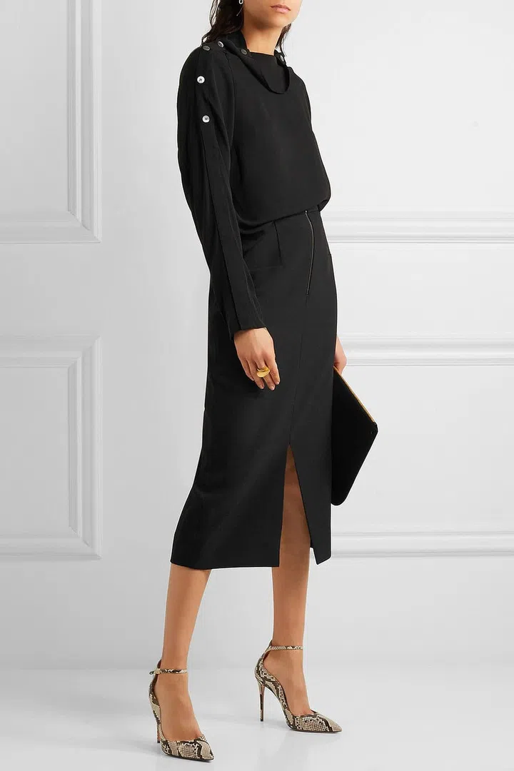 It ends mid-calf with front and black slits for easier movement and also helps in tempering the slim pencil silhouette. Wear this with a v-neck blouse, tucked in and teamed with pointed stiletto shoes.