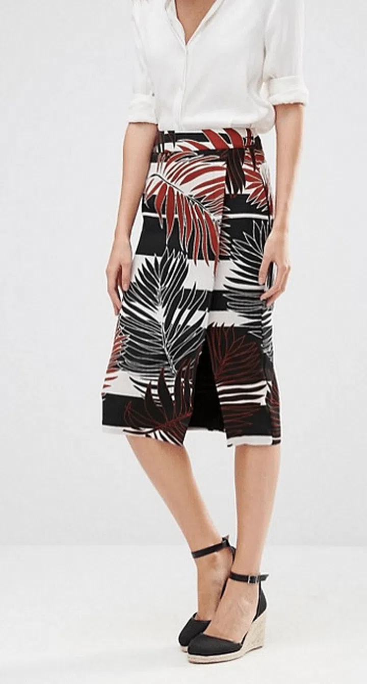 Printed all-over with leaf motifs, we suggest keeping the top simple to not outshine the skirt.