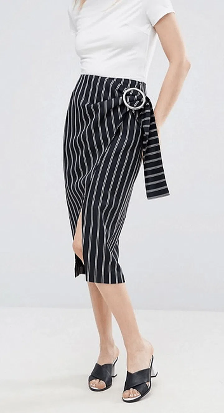 Asos pencil skirt in stripe with large buckle detail, $81.89