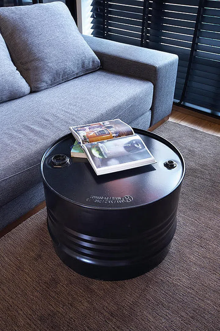 Interior designer Kevin Teo, founder of Space Sense Studio, salvaged an oil barrel and spray painted it matte black for it to serve as an unusual coffee table to match this industrial-style home.