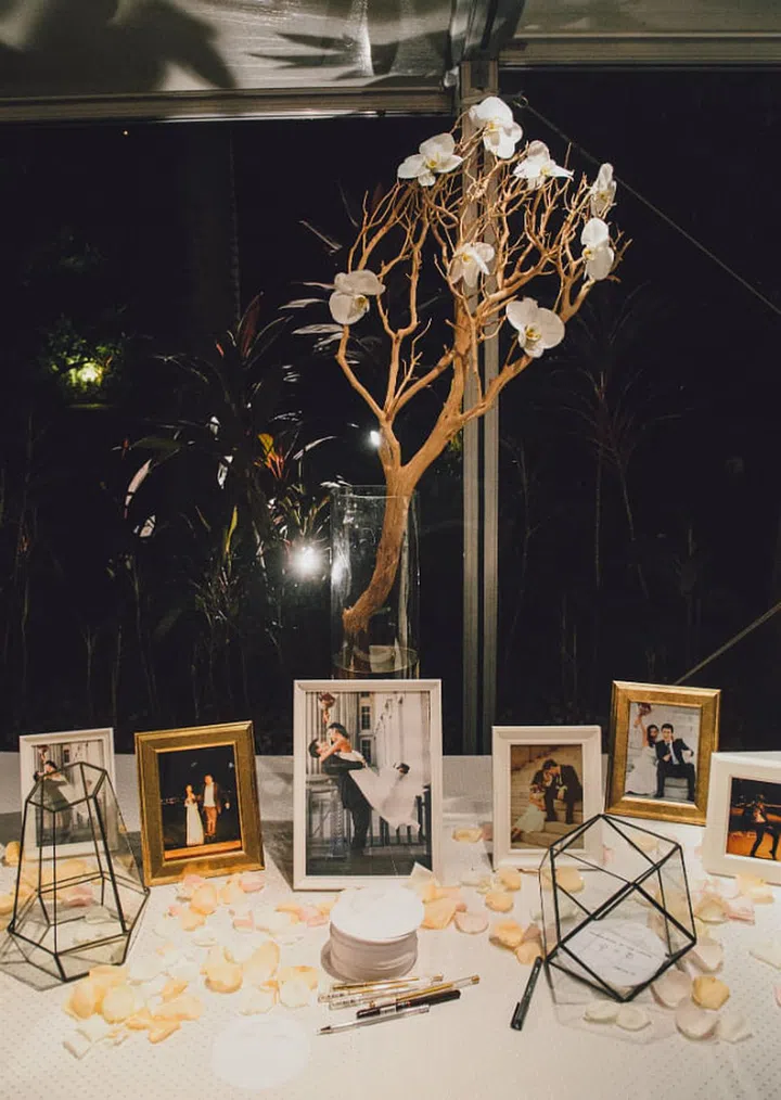 Photo frames and notes for guests to write their well-wishes on decorated the pretty reception table.