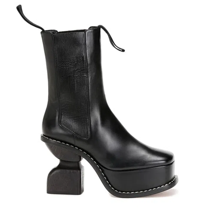 Giving the platform boot a modern minimalist twist, Loewe’s Platform 100s are set on a sculptural wooden heel resembling a chess piece of sorts. Made from smooth glossy leather with elasticated sides and a contrasting top-stitching along the soles, these statement boots are polished enough for the boardroom.