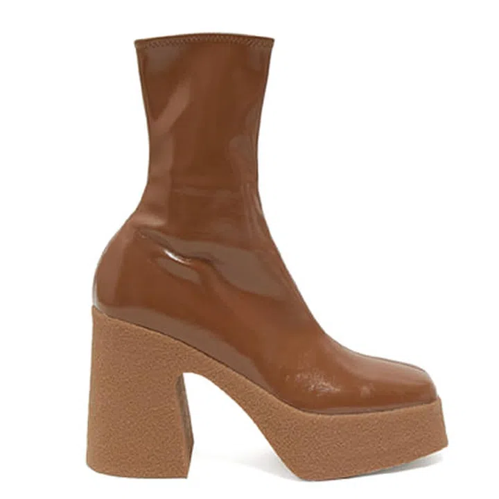 Channeling the ‘60s, Stella McCartney conjures her own contemporary reimagination of the platform boot with this patent faux-leather rendition. Featuring smooth caramel coloured patent leather that’ll stretch to hug your ankles just like a sock boot, these boots are finished with a square toe and a textured crepe sole. Team yours with a mini knit dress and an oversized slouchy bag.