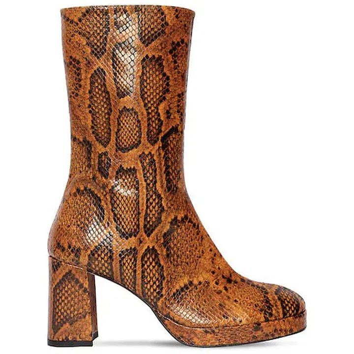 Still can’t get enough of the animal print trend? We’ve got you covered. Made from orange-hued reptile skin-effect calf leather, these boots will get you to embrace your wild set. Anchor these statement-making shoes with neutral monochromatic look consisting of a satin brown top, beige mini skirt and a lightweight rust-coloured trench coat.