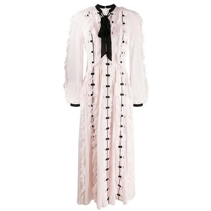 Rendered in soft seashell pink, this frill-trimmed dress features floral applique in place of vintage chintzy floral prints, making this number a great alternative for those who aren’t big fans of donning prints. Featuring long sleeves and a black ribbon tie at the neckline, this dress sports a conservative hemline which renders it appropriate for the workplace. Team this with a pair of sensible derby shoes and pearl drop earrings for the office.