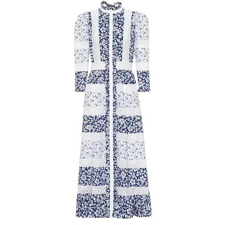 Alexander McQueen taps into a dark, romantic Victorian-esque aesthetic with this sweet white and blue floral maxi. Fitted with a high neckline, crochet-trimmed placket and lace inserts in white, and contrasting white fabric with ditzy cornflower blue florals seemingly ”patchworked” onto the dress, Style this dress with a statement waist belt and edgy ankle boots.