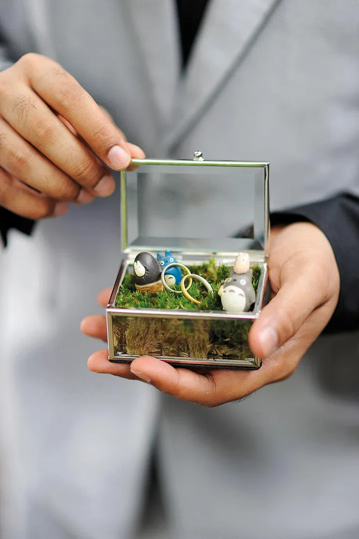 Yuling & Anders' wedding rings sat in a glass box filled with real moss and Totoro figurines - an Japanese anime character that both of them loved.