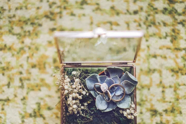 Eileen and Calvin nestled their rings in this succulent-filled glass case with some pretty baby's breaths, in keeping to their rustic vineyard inspired wedding, that saw more foliage than flowers.