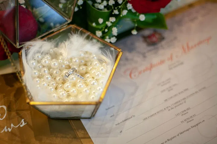 Pearls will never go out of style. We love the luxe pairing of silver and diamonds against the beads of pearls in Fion & Xiu Long's wedding ring glass case!