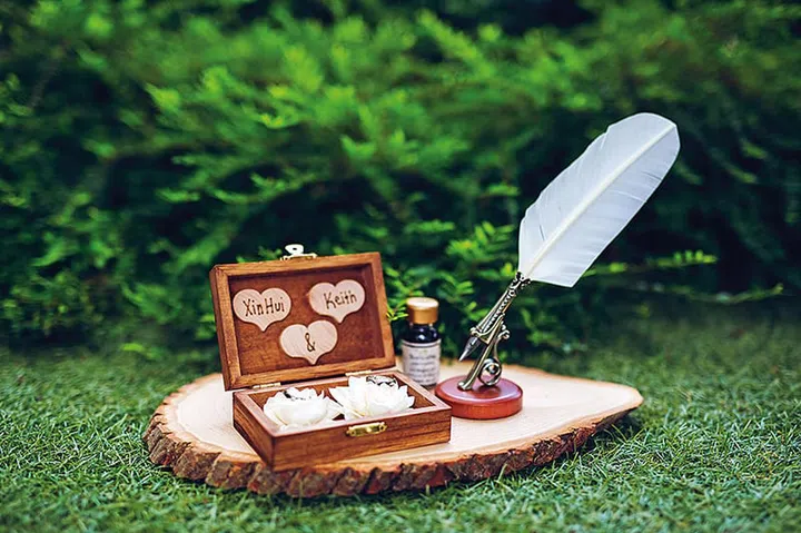 Xin Hui & Keith tied the knot with a English garden themed wedding, which is reflected in their choice of this classic wooden ring box accompanied by a feather pen and ink.