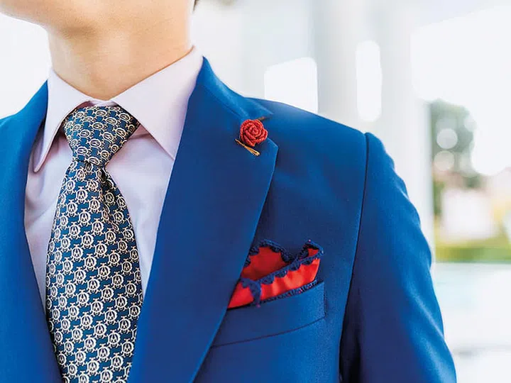 Po Loong's cobalt suit is jazzed with lapel pins and crocheted pocket squares.