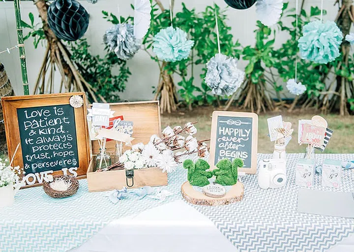 This whimsical pastel blue setting is a dream - complete with chevron stripes, cotton branches, raw cotton balls, and mini squirrel hedges.