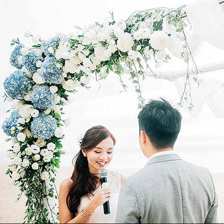 This pastel white and blue floral arbour was designed by the bride herself. Perfect for a beach wedding!