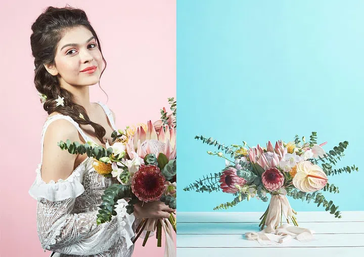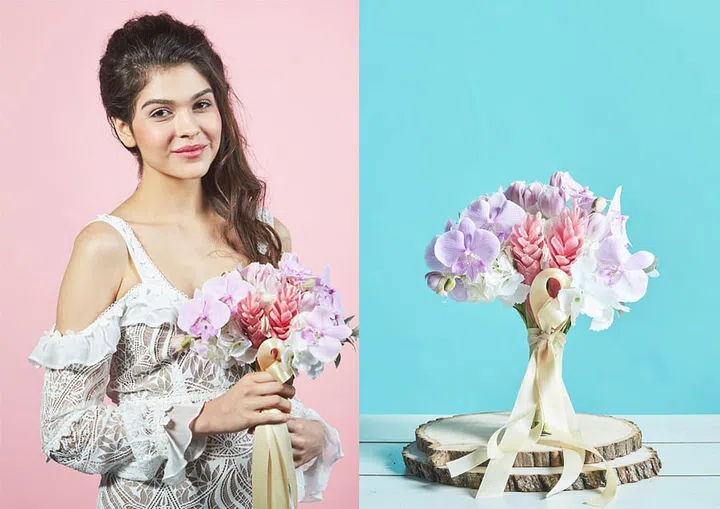 Makeup artist Ernest Lim opted for a more natural-looking face to balance the effect of a colourful bouquet. A wash of pastel pink on the lids adds a romantic effect, while a dab of pearlescent eyeshadow at the inner corners brightens the peepers. A soft pink blush and a glossy pink lip create a radiant glow.