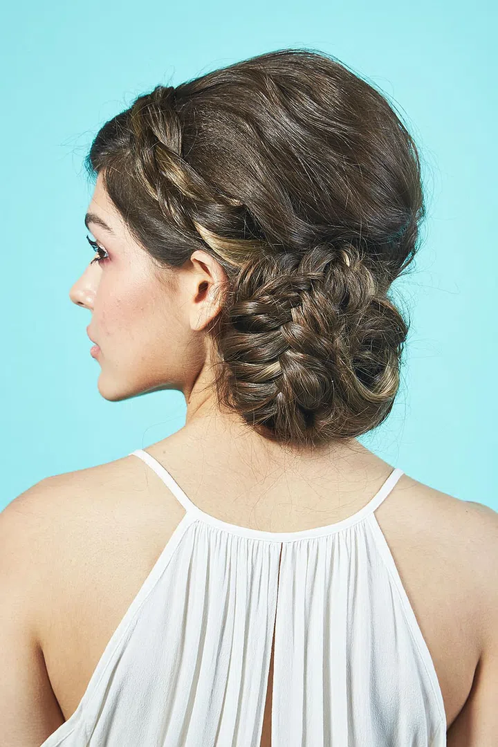Add a twist to the elegant braid, fashioned into a bun. An eye-catching braid adds a twist to the classic updo! This style is a go-to for a braided wedding hairstyle.