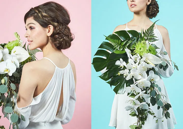 Uniquely shaped white blooms and crisp greens are a super chic option for modern brides. On the face: mauve eyeshadow and eyeliner, and nude pink lips.