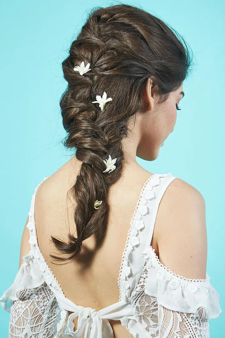 A loose braided pony dressed with blooms turn up the pretty factor and adds to the boho vibe for an outdoor wedding.