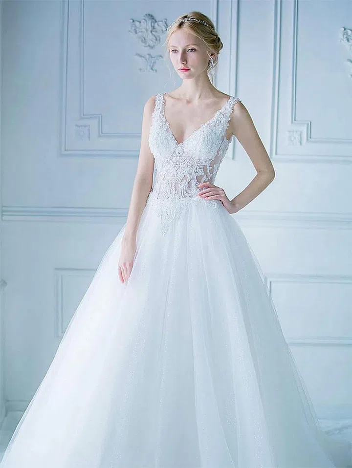 Be a vision in this oh-so-feminine number as you glide your way down the aisle.