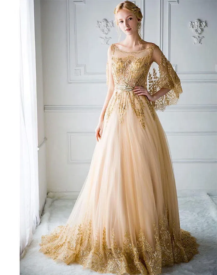 Don't be afraid to stand out in this hip-meets-haute regal gold evening gown.