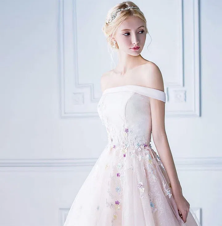 For a look thats soft and surprising, pick this off-shoulder wedding dress with delicately colored floral applique and full tulle skirt.