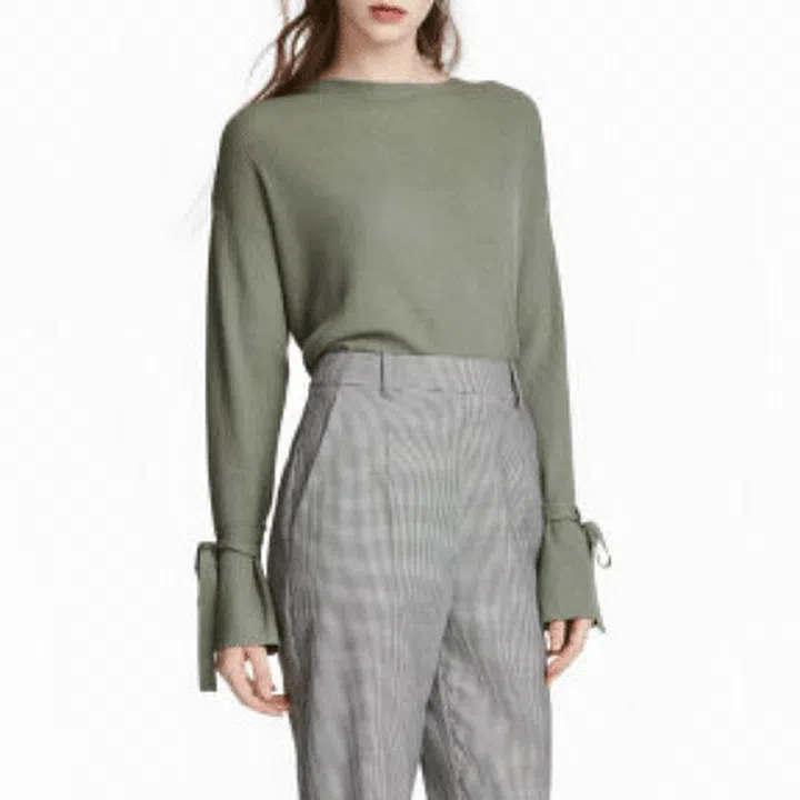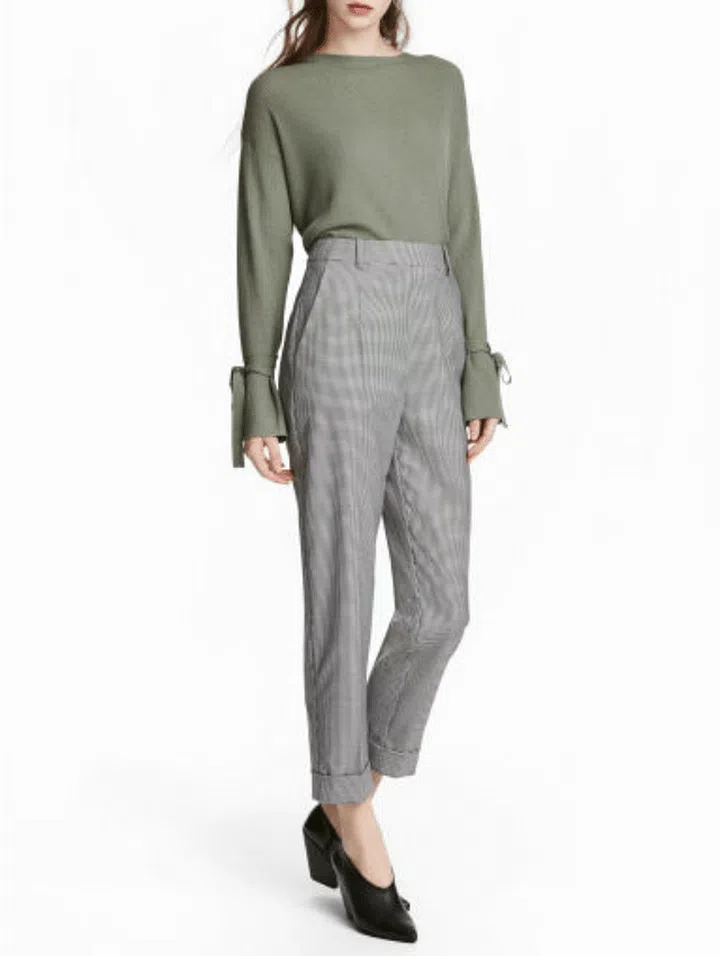Tailored pants is another work wardrobe essential. A pair of dogtooth checkered trousers with a defined silhouette can afford you some leeway with a slightly more casual top, like this khaki jumper. Oh yes, we’re definitely loving the ties at the cuffs – it’s all about the details, remember?