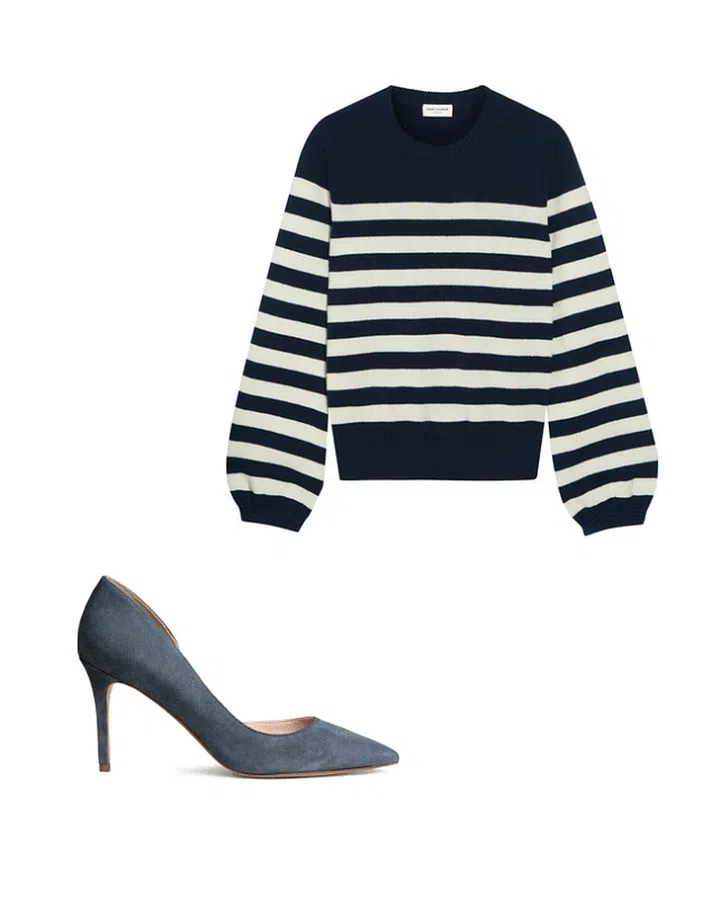 Heels are a surefire way to look professional. Throw on some pointy ones so you don’t just get that much-desired height boost, but also look even more put together with the tapered toe box. These suede shoes in a unique dark grey-blue, together with a complementary striped pullover, will get your boss’ stamp of approval.