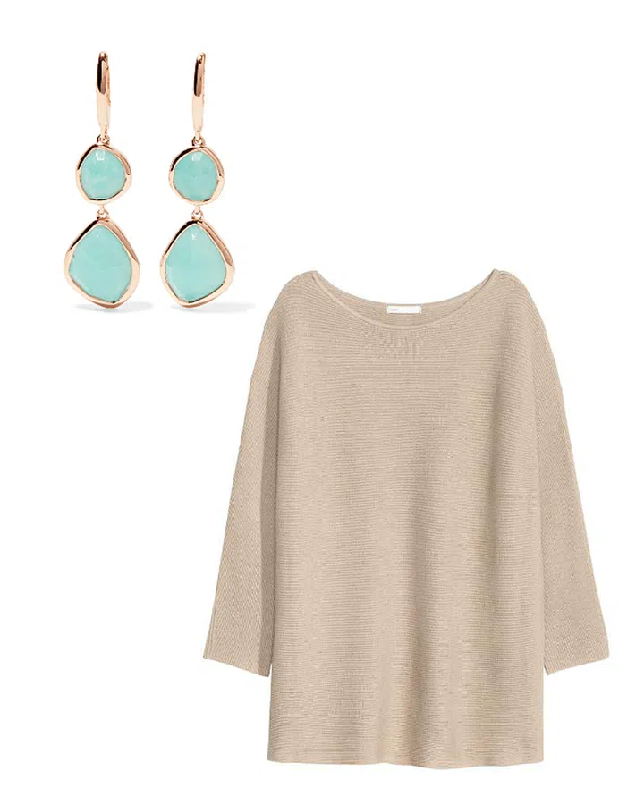 To keep things classy, your best bet is to go with a plain pullover like this one in a subtle beige, then add some statement earrings to instantly elevate your look. The focus will be on your earcandy, which comes in a winning combination of rose gold vermeil and raw-cut amazonite stones.