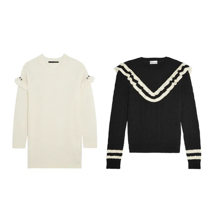 Strategy is the name of the game when you’re incorporating a tricky piece into your work outfit. Choose pullovers with chic details so you don’t look like you just rolled out of bed. For instance, ruffle trims embellished with crystals and faux pearls, and a striped ruffled bib and cuffs add visual interest and lend polish to your look.
