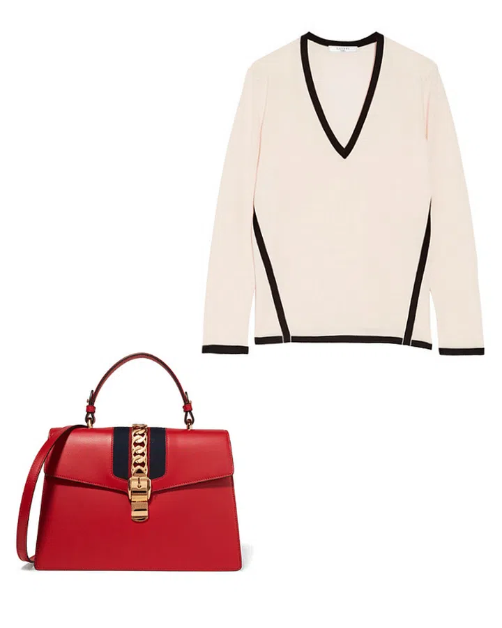 Pullovers can be rather shapeless, so you want to opt for a structured bag to balance the “puffiness” and not veer into casual territory. A smart and sleek bag is all you need – this one from Gucci resembles a modern, female version of the briefcase, and the striking red, which shouts #girlboss, just seals the deal.