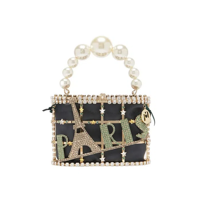 Another far-from-average bag to carry for your date night out is none other than this Holli Paris crystal-embellished cage handbag from Rosantica. Studded with beige, green and white crystals that spell out the word Paris in the formation of the Eiffel Tower, this statement piece is a trendy piece that anyone will fall in love with at first sight. Très chic indeed.