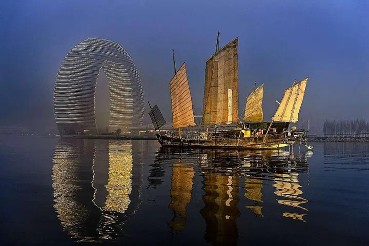 A glowing horseshoe casts its reflection on Taihu Lake in Huzhou, forming a bright figure eight, which is auspicious in Chinese culture for its phonetic similarity to the Chinese character, fa (fortune). The inspiration for its shape came from traditional arched Chinese bridges.