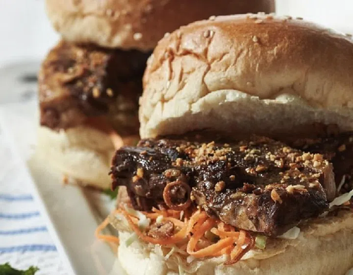 5 To serve, spread the mayonnaise on the buns’ bottom halves. Top each with coleslaw, followed by two slices of pork coated in the gravy, and the top half of the bun.