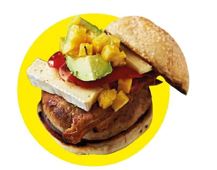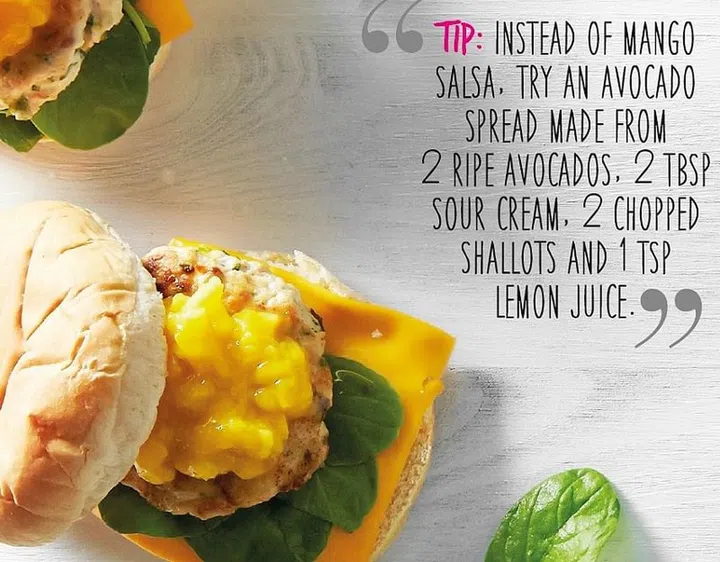 4 Sandwich a patty in a burger bun with a slice of cheese, arugula and a dollop of mango salsa.