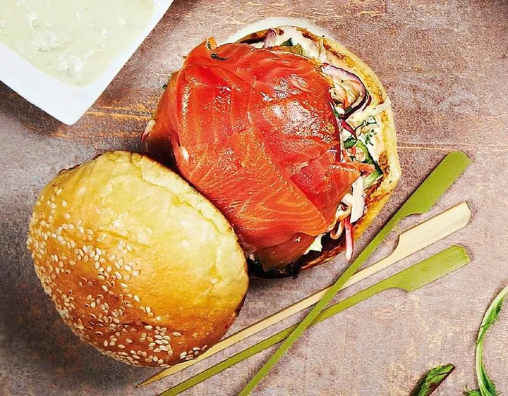 3 Spread the 4 tbsp of dressing on the cut sides of the buns. Place the Asian slaw, then the smoked salmon, on the burger bases, and cap with the burger tops.