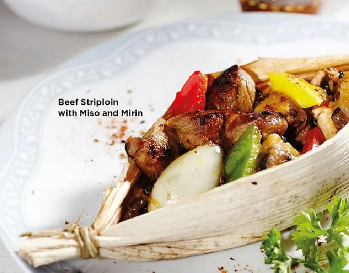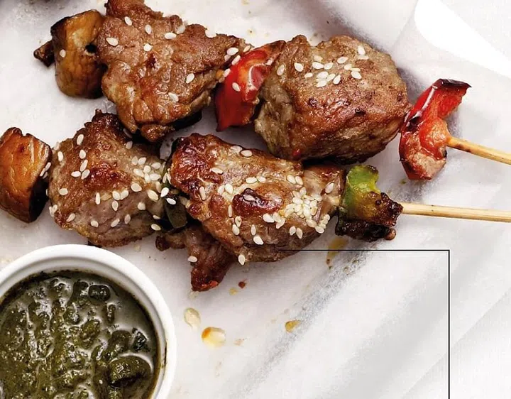 3 Sear the skewers on a hot pan for 2min, until all sides of the meat are seared. Remove from heat and serve on a plate.