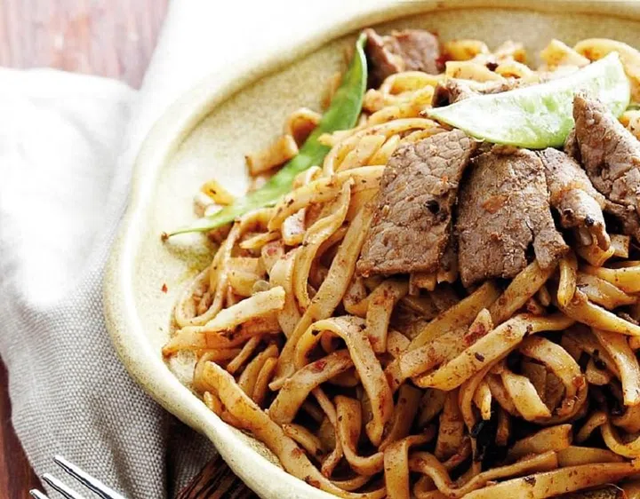 4 Add the noodles and black bean sauce, and stir well to coat. Toss in the beef and combine well. Remove from heat and serve.