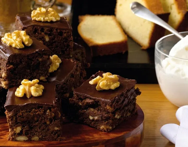 6 To make the glaze, melt the butter and chocolate. Mix in all the other ingredients, except for the walnut halves.